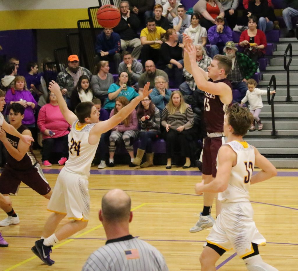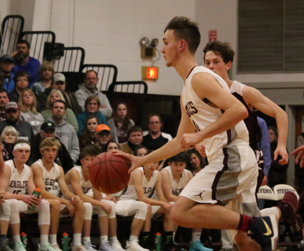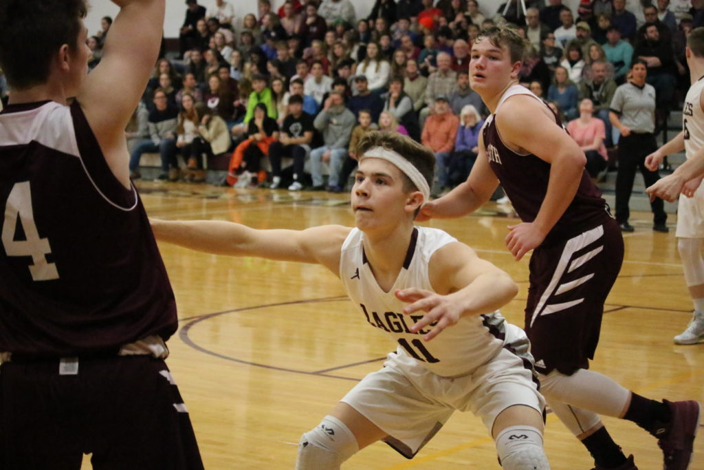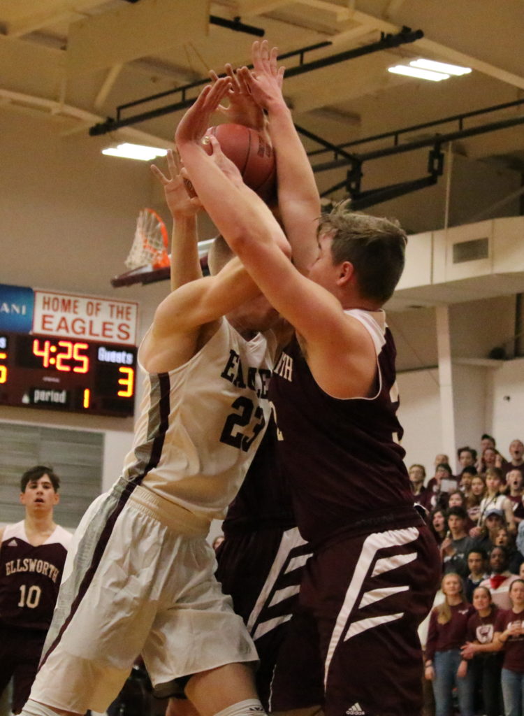 The Eagles grabbed a solid 19-8 first quarter lead against Class B Ellsworth and never looked back. Sophomore Caden Mattson set the tone with back-to-back three-pointers early in the first quarter, and the Eagles exited the floor at half time ahead 29-17.  They ended with a  60-38 victory, allowing the Class B team only five points in the third quarter.