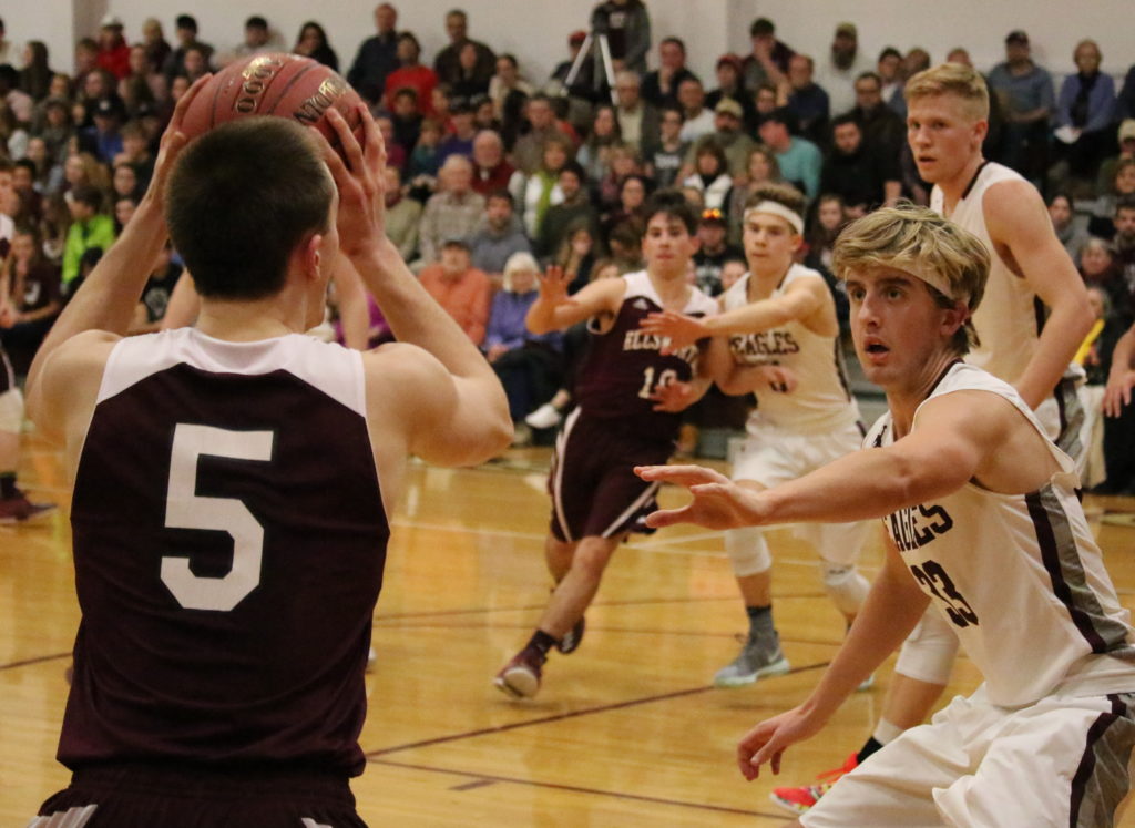 Sophomore Caden Mattson helps drives the Eagles’ defense against Ellsworth December 15.