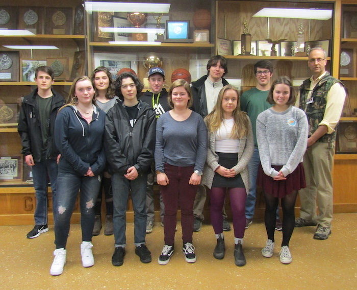 The 2019 George Stevens Academy sailing team includes, in front from left, Frances Spangler, Gabe Hall, Chloe Sheahan, Clementine Bannon and Katie Forrest. In back are Morgan Davis, Marie Boulet, Ryan Mitchell, Wyatt McKechnie, Tom Mount-Miller and coach Andy Stephenson. Not pictured are Hope Bowden, Silas Murnik and Joe Ciampa. Photo courtesy of Larry Gray
