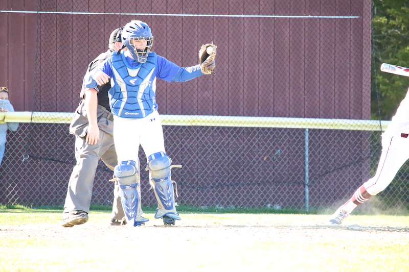 Catcher Nathan Thompson’s glove finds the pitch from the mound May 6 in Blue Hill. Photo by Anne Berleant