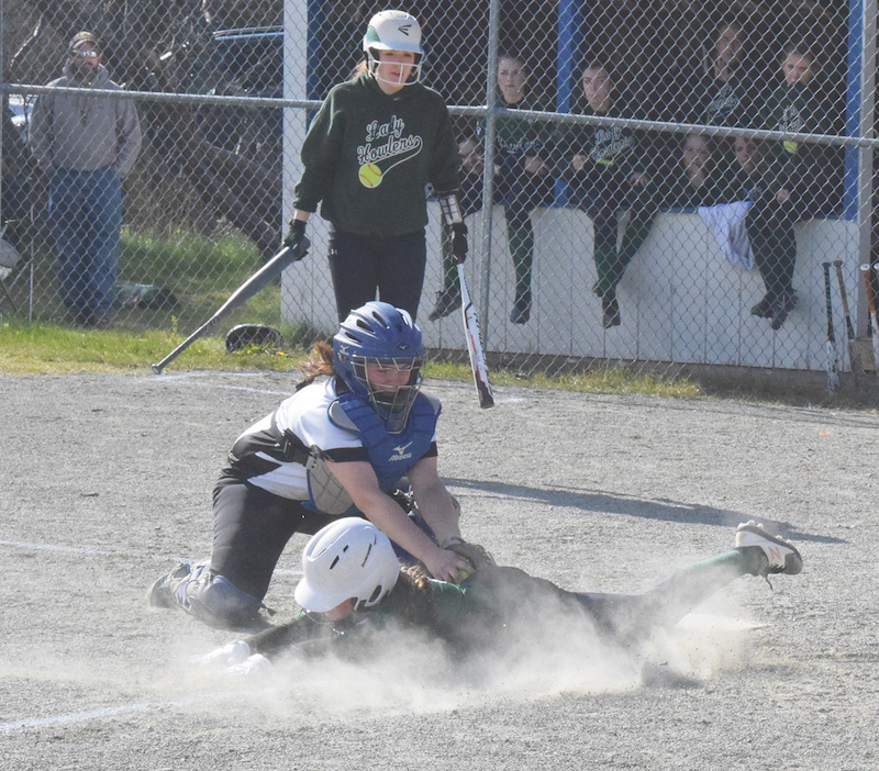 Deer Isle-Stonington catcher Kaylee Morey makes the tag at home plate during a game against Penobscot Valley on May 13. Photo by Jack Scott
