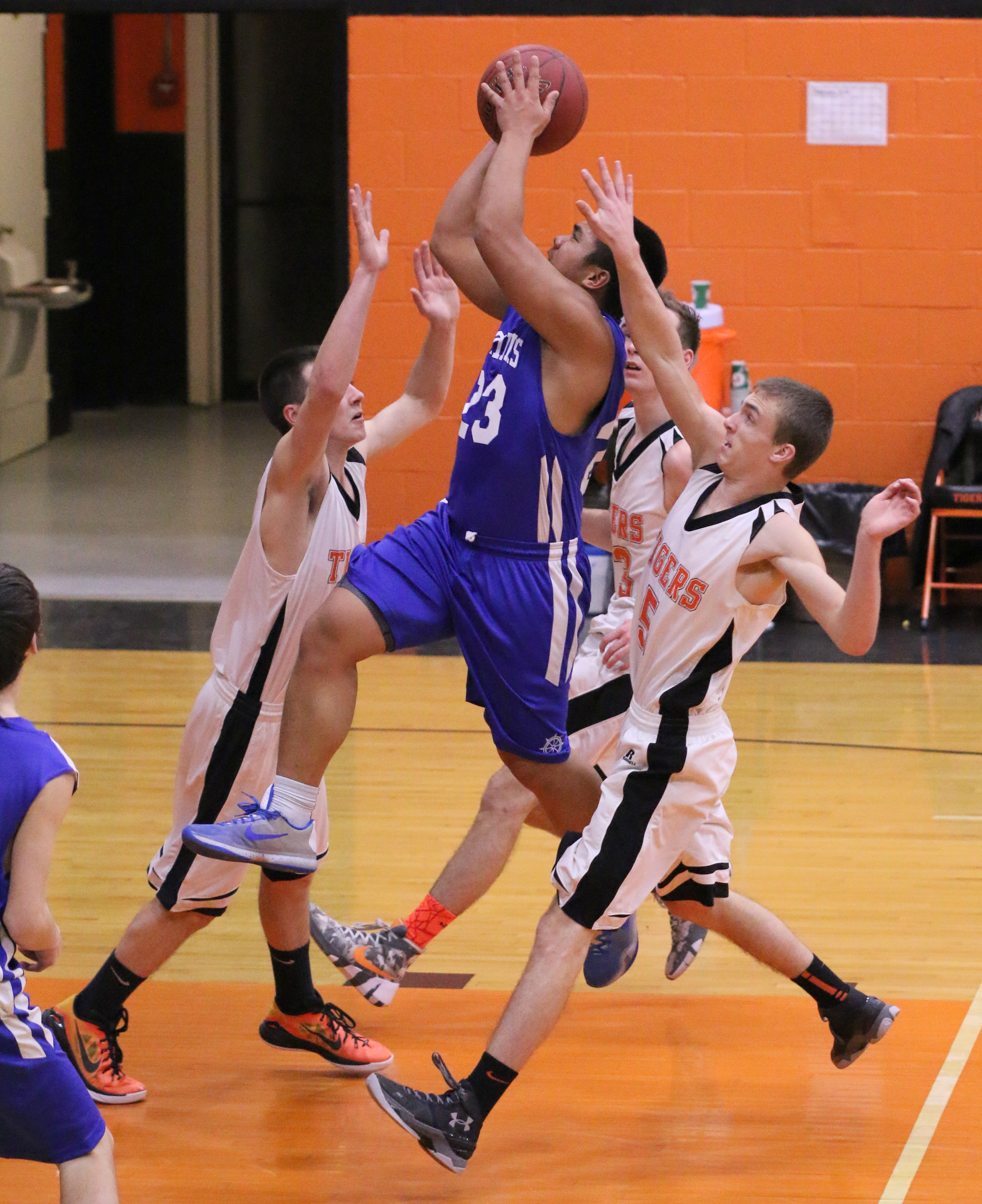 Krisford Melanio hooks a lay up in the preliminary playoff game against Shead on February 10. Photo by Sandra Shepard