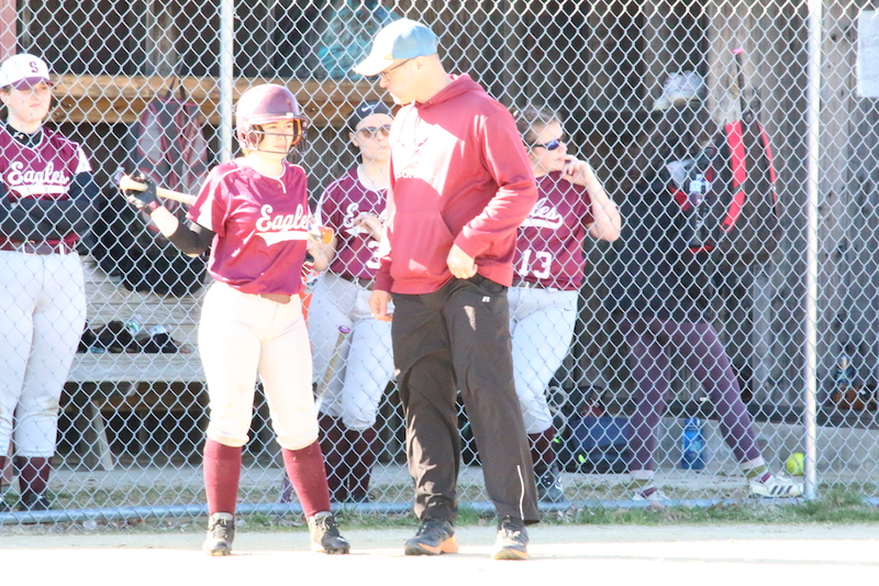 GSA softball coach Todd Eckenfelder counsels Crystal Forget during a May 6 game against Deer Isle-Stonington. Photo by Anne Berleant