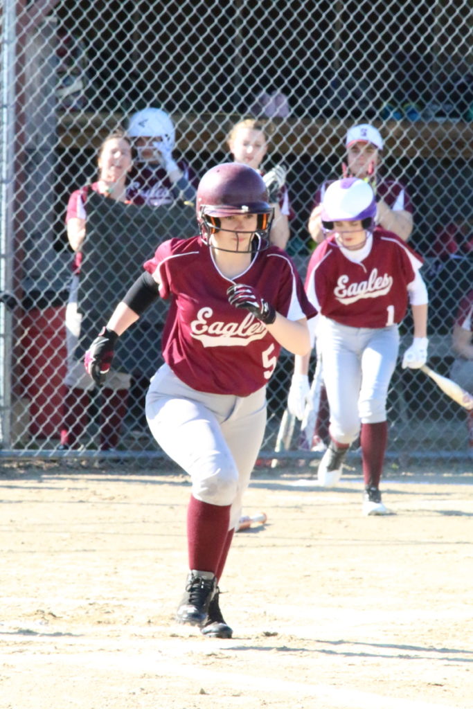 Crystal Forget takes the walk to first base during a May 6 game against Deer Isle-Stonington. Photo by Anne Berleant