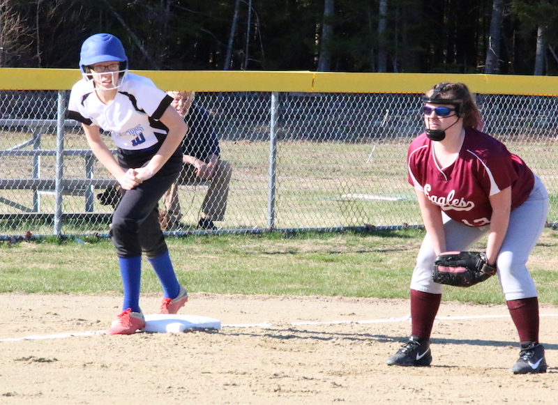 Rylee Eaton looks for an opportunity to steal home during a May 6 win against George Stevens Academy. Photo by Anne Berleant