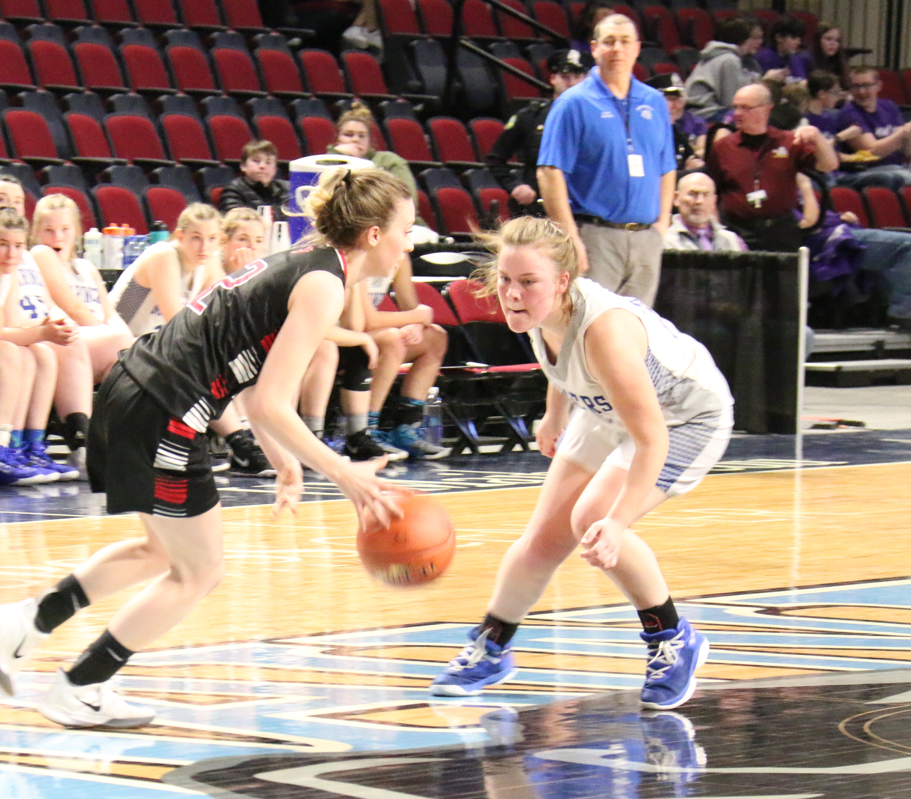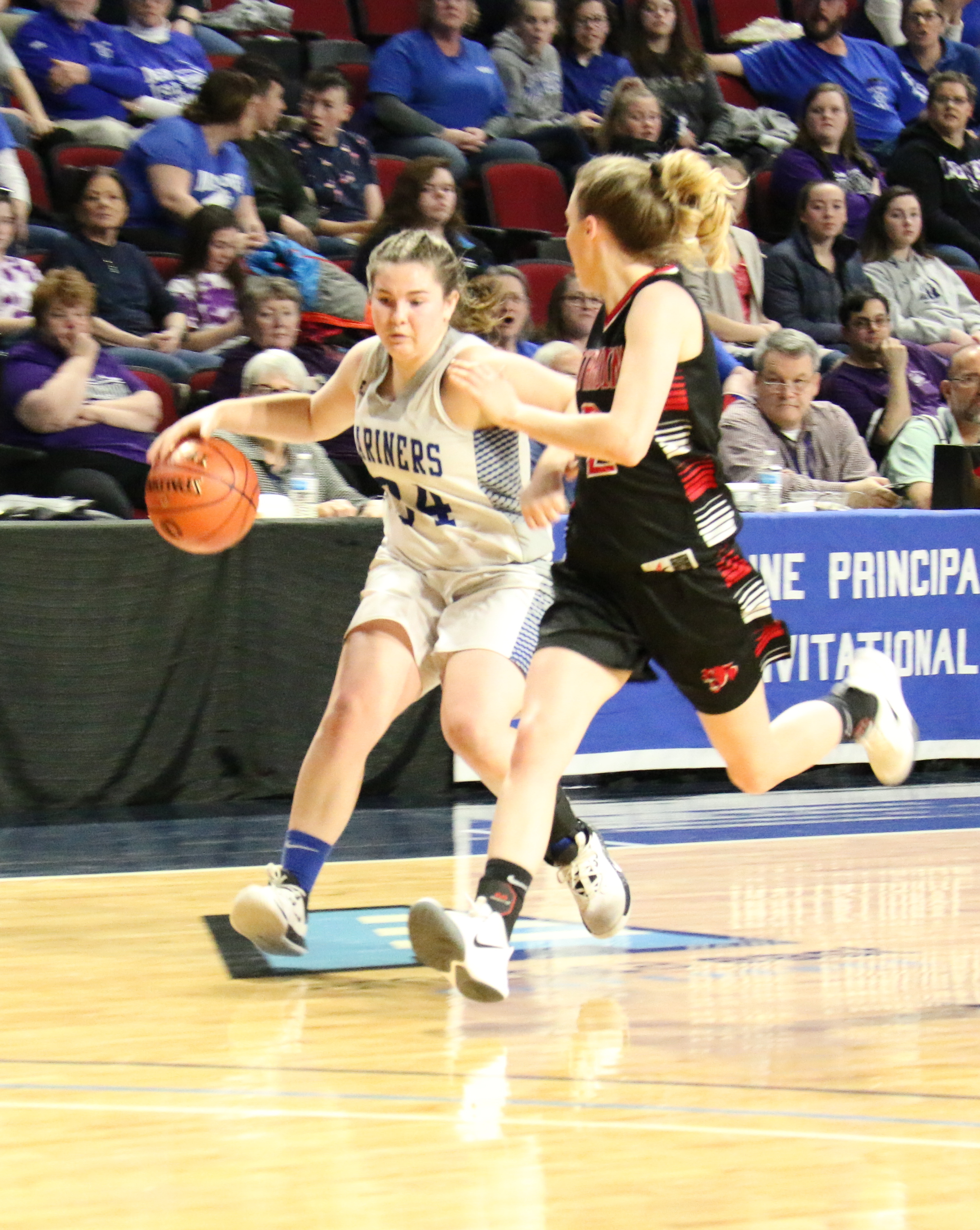 Kaylee Morey drives in to shoot, leading scoring for the Mariners’ semifinal win. Photo by Anne Berleant