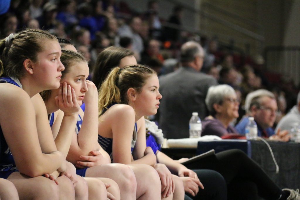 From left, Makayla Lebel, Ella Marshall and Maggie Bubar watch the final seconds of the championship game.