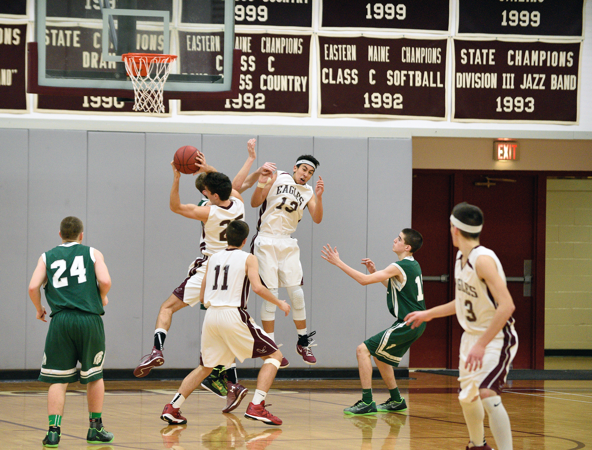 Mariners Matt Duddy and Ethan Shepard fight for the rebound with Max Mattson of the Eagles at Deer Isle-Stonington. Photo by Jack Scott